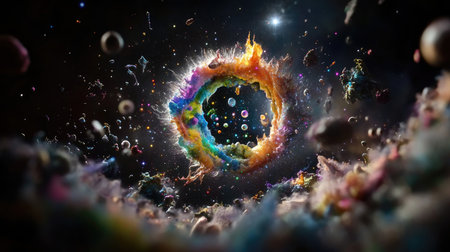 A captivating cosmic portal showcases a vibrant spectrum of colors amidst swirling nebulae and celestial bodies, inviting exploration and wonder.