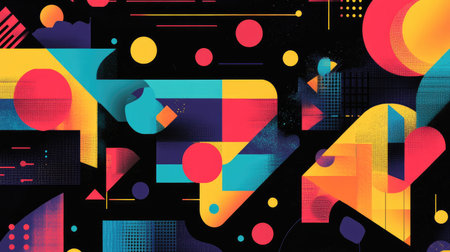 This image showcases a vibrant arrangement of abstract geometric shapes in bold colors and striking textures, perfect for creative projects and backgrounds.