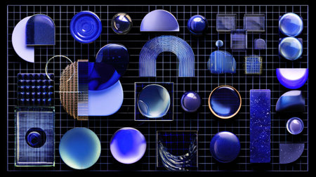 An assortment of abstract shapes, primarily in shades of blue, are arranged on a black grid background. The composition includes spheres, squares, and semi-circles, with varying textures and transparency. The lighting appears diffused, emphasizing the forms. This design is suitable for various applications, including graphic design and digital media projects.