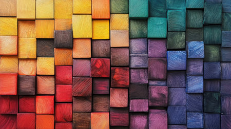 This image showcases a stunning arrangement of colorful wooden cubes in vibrant shades, creating a visually captivating and dynamic pattern ideal for various creative applications.