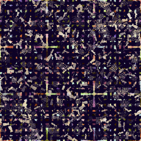 Exotic multicoloured boho geometric camouflage scatter print. Seamless autumnal dark ground detailed repeat pattern.
