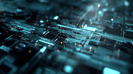Futuristic circuit board close-up with vibrant blue and orange lines, creating a dynamic, tech-inspired abstract scene.