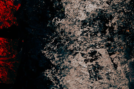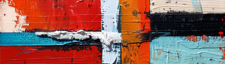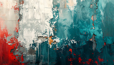An abstract textured wall with peeling paint in red, teal, and white splatters and drips.