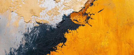Captivating abstract texture featuring vibrant yellow and black paint splashes on a textured gray surface evokes creativity and artistic expression.