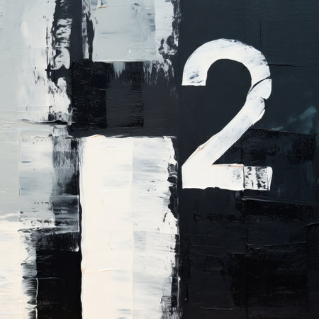 the photo captures two paintings by ryan hewett and nicolas de stael. the artworks feature large numbers painted on a black background, showcasing an industrial texture in white and gray. the high-quality photo highlights the ultrafine detail of the paintings, reminiscent of the artistic style of antanas sutkus. ai generated