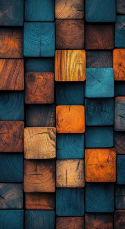 Abstract iPhone wallpaper with wooden blocks in various shades of brown, orange, and blue. --ar 43:78 --v 6.1 Job ID: 231f8226-3026-4a13-ba7c-fda80b487635