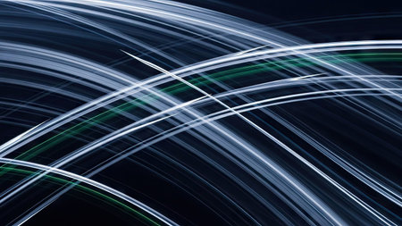 Dynamic composition displays sweeping, luminous lines of light. The image features a dark background, accented by layers of white and touches of green. This visual style could be applicable for digital art, technology presentations, or design elements for various commercial projects.
