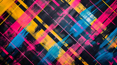 Dazzling abstract geometric plaid pattern with vivid neon pink blue and yellow shapes and hues against a deep inky black background creating an energetic and lively visual composition