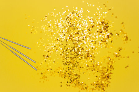 Confetti stars and sparkler sticks on a yellow background. The view from the top. The concept of the celebration.