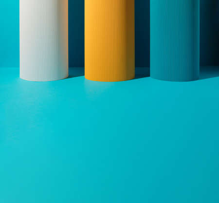 Three paper pillars - white, yellow and blue on blue background with copy space.