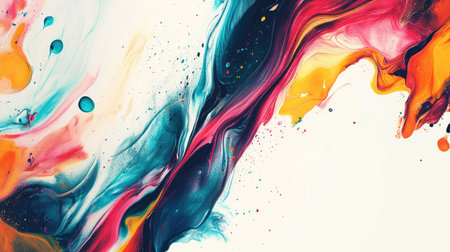 Thick liquid paint mixing, forming dynamic flowing patterns and intricate splashes with diverse colors