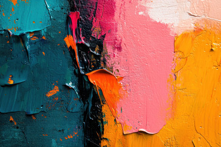 Close-up of a vibrant abstract painting featuring textured brushstrokes in teal, orange, pink, and black.