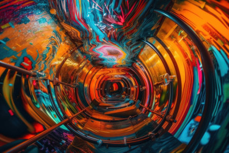 A vibrant abstract artwork showcases swirling colors like orange, yellow, blue, and black. The dynamic patterns reflect creativity and energy, capturing attention and evoking emotion.
