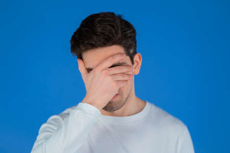 Young man doing facepalm gesture, like no, I forgot. Unhappy guy feeling sorrow, regret, drama, failure. He isolated on blue wall