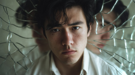 A person gazes intently through cracked glass, hiding struggles with shame and guilt