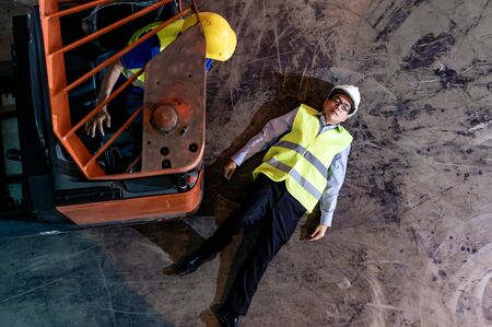 Asian warehouse manager lying down on warehouse floor after accident from forklift. Using for safety first and business insurance concept. Aerial top view.