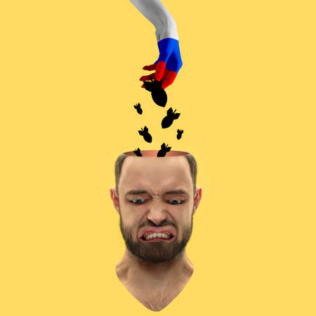 Contemporary art collage. Russian hand putting rocket bombs inside male head isolated over yellow background