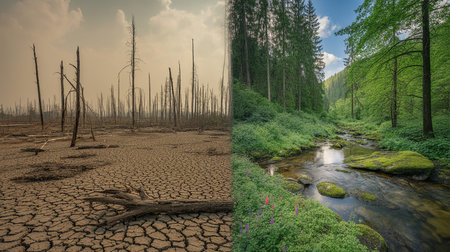 Split image showing a dry, cracked landscape with dead trees and a lush green forest with a stream