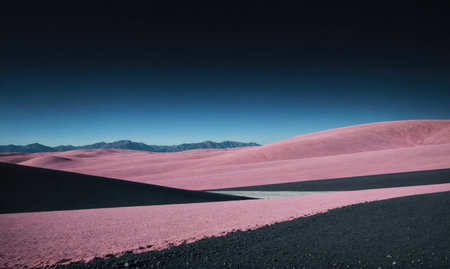 A pink desert landscape with a small lake in the distance, under a blue sky