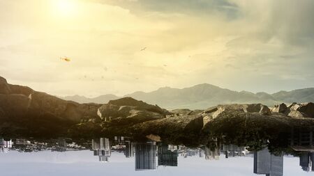 Landscape with mountains and reflection in water. Collage. Selective focus.