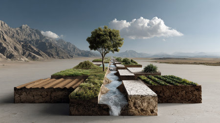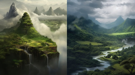 This artistic landscape showcases various terrains, including lush greenery, flowing water, and rocky mountains. A serene natural scene invites reflection and inspiration.