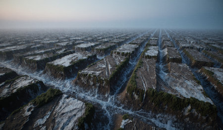 a large mountain shrouded in fog and adorned with rocks creates an ominous and surreal atmosphere. this urban culture exploration photograph captures the fusion of water and land, with dusty piles adding to the mysterious vibe. the image is reminiscent of the kodak plus-x style and features intriguing juxtapositions, reminiscent of swiss design. ai generated