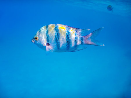 closeup view from a single indopazific sergeant fish in the blue water while snorkeling in egypt