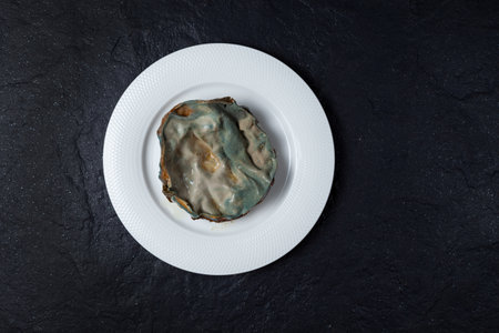 Terrible expired food covered with mold on white plate, top view. Dark background made of natural stone, copy space. Concept - reduction organic food waste.
