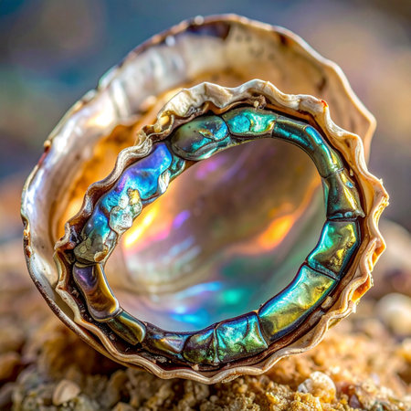 This close-up image captures the stunning interior of a shell showcasing vibrant iridescent colors. A testament to nature