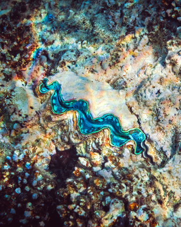 A closeup of a giant clam its iridescent shell shimmering in the light