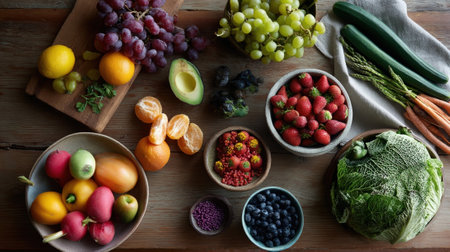 An assortment of colorful fruits and vegetables arranged artistically on a wooden table emphasizing a healthy diet