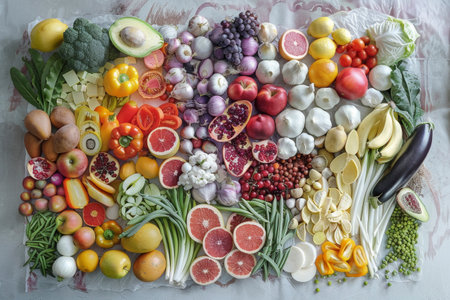 A vibrant collection of assorted fruits and vegetables arranged artistically. Perfect for showcasing fresh produce, healthy eating, and culinary inspiration.