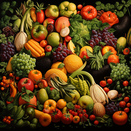 Vibrant and nutritious assortment of fresh fruits and vegetables on dark solid background