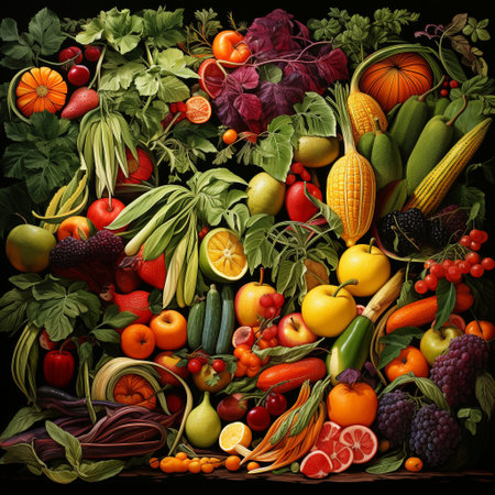 Experience the vibrant and visually striking artwork titled Nature's Tapestry: A Harmonious Blend of Fruits and Veggies. This bountiful display showcases the seamless intertwining of various fruits and vegetables, forming an intricate and colorful tapestry that captures the essence of nature's offerings. The art style combines elements of realism and abstraction, amplifying the visual impact and creating a captivating image that thrives on microstock sites.