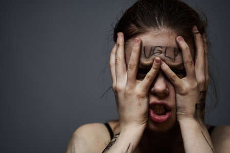 Emotional woman with inscriptions on body upset with frustration gray background