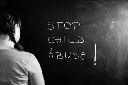 Child violence and abused concept. Little sad girl with Stop child abuse text writted on a blackboard