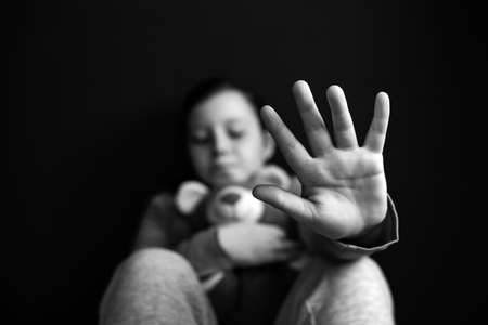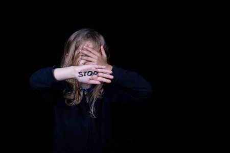 Child violence and abused concept. Little girl sitting in a dark room, showing stop sign