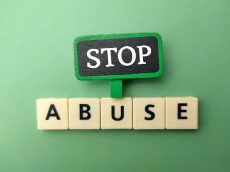 Abuse- word composed fromwooden blocks letters on White background, copy space for ad text.