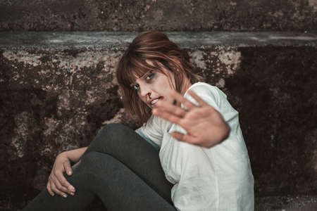 A woman in front of a dirty wall, desperate, crying and wound girl. looking with a look of sad, on the ground on a sidewalk.