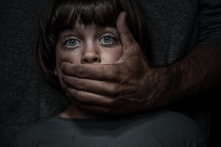 Human trafficking concept, human rights violations, scared child with man's hand covering child mouth,