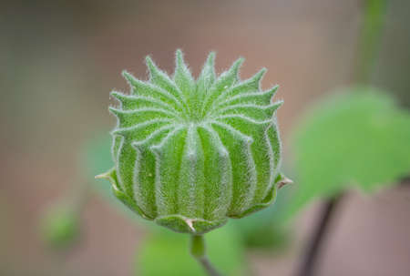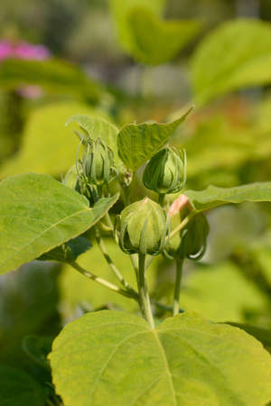 Pink bud of a hibiscus garden. Big tall flower in the garden. Close up view.