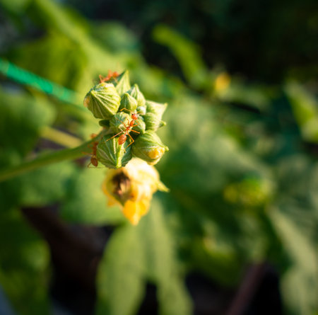 Macro shot of red ants on a flower with out of focus background. Solenopsis are stinging ants, including ginger ants and tropical fire ants.