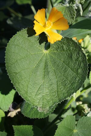 Abutilon theophrasti leaves and flowers. The plant is also known as velvet plant, velvet weed, Chinese jute crown weed, button weed, lantern mallow, butter print, pie-marker, or Indian mallow.