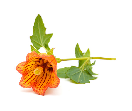 Orange flowers of Abutilon pictum 'Mardi Gras' MARDI GRAS FLOWERING MAPLE, PAINTED INDIAN MALLOW in the garden. Summer and spring time