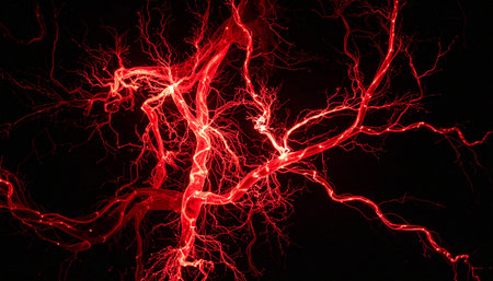 Detailed perspective of blood vessels filled with bright red cells on a twisted, dark background. The intricate network highlights the beauty of biological structures.