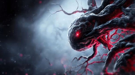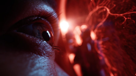 Electrical discharge illustration of plasma field showing glowing red veins and energy. On dark backdrop generates technological power and concept.