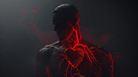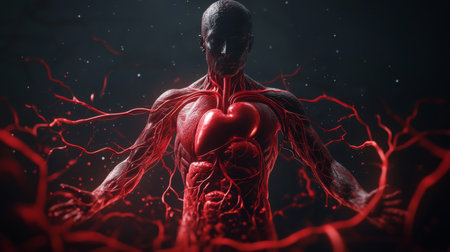 This striking image captures the essence of human anatomy with an artistic focus on the heart and surrounding blood vessels, evoking themes of vitality and life force.