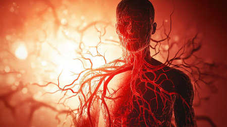 A striking illustration of human anatomy showcasing the circulatory system in a bold and artistic style. Ideal for educational and medical projects.