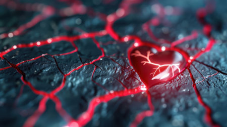 A vibrant red heart rests on a cracked, dark surface, illuminated by a soft glow. This abstract image symbolizes love and emotion, ideal for artistic projects.