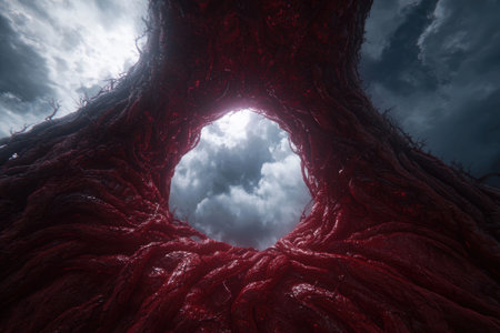 Surreal red organic tunnel with cloudy sky